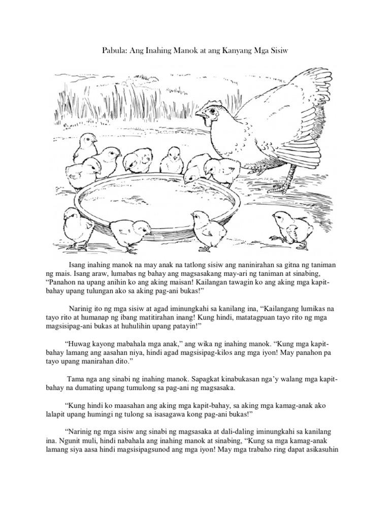 Ang Inahing Manok at ang Kanyang Mga Sisiw. Ang inahing manok at ang kanyang mga sisiw Isang inahing manok na may anak na tatlong sisiw ang naninirahan sa gitna ng taniman ng mais. Kailangan tawagin ko ang aking mga kapit-bahay upang tulungan ako sa aking pag-ani bukas.